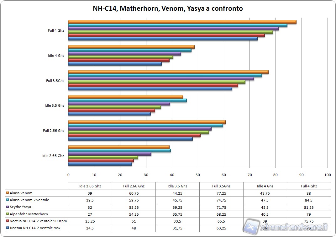 Confrontando i risultati con quelli ottenuti dagli altri dissipatori  della comparativa possiamo notare come il Noctua NH-C14 ne esca vittorioso in tutte le situazioni. C’è da dire che gli altri dissipatori in questione hanno un costo relativamente inferiore rispetto a quello del Noctua.