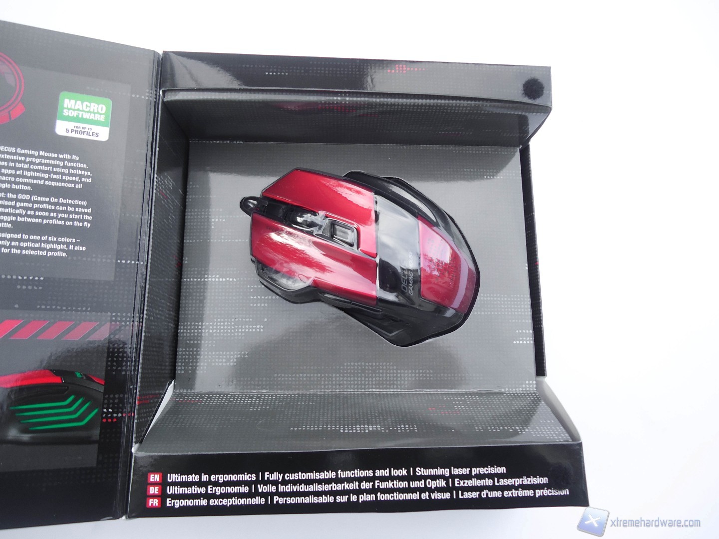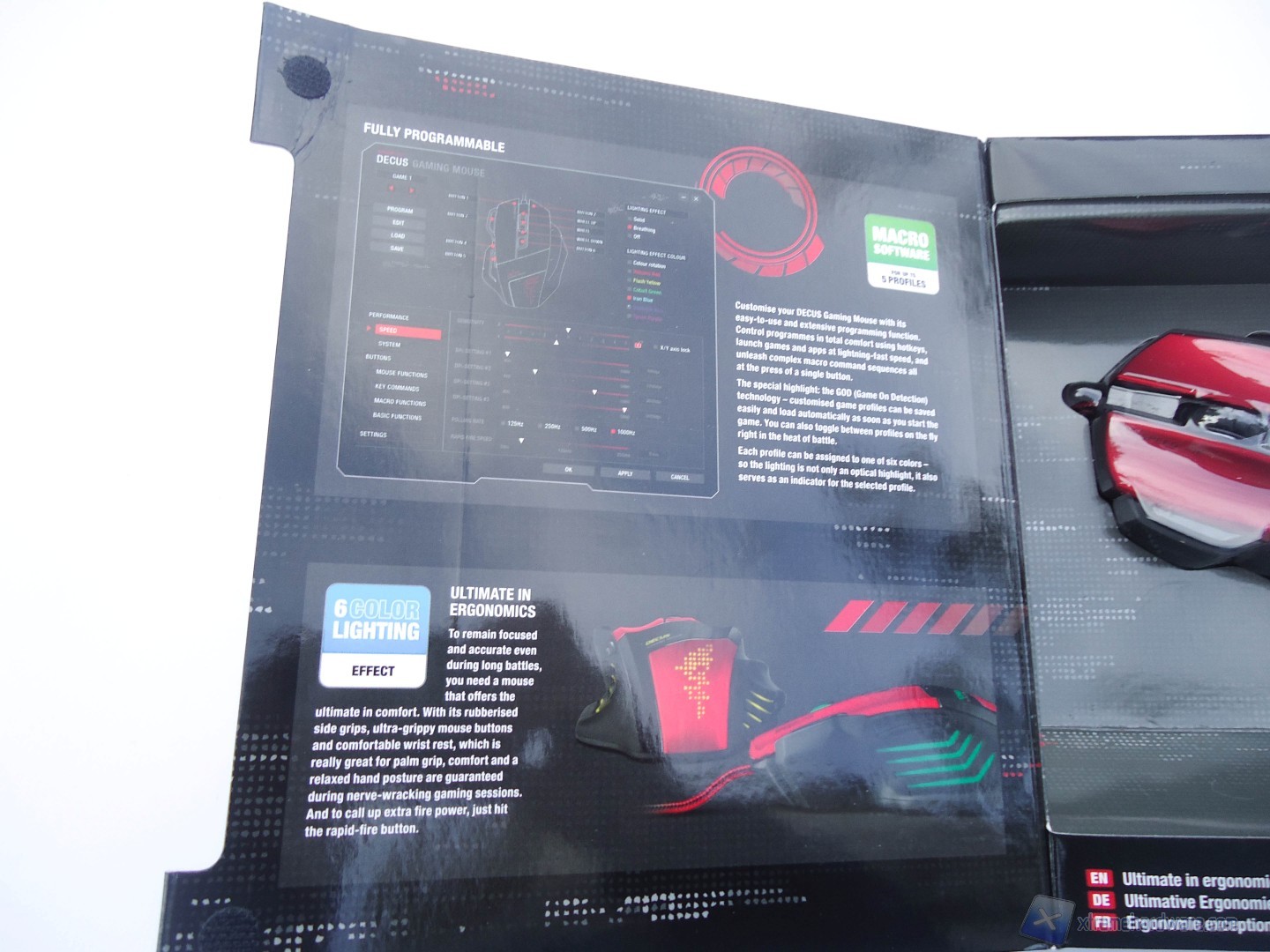 La scatola del Decus richiama i tipici colori gaming della casa tedesca e come quasi tutte le confezioni di mouse da gioco presenta anche un’apertura a libro. Nella parte frontale della confezione abbiamo una grande immagine del prodotto accompagnata da varie scritte e bollini che ci presentano le caratteristiche essenziali dello stesso. Aprendo la scatola come fosse la copertina di un libro notiamo che nella parte destra viene messo in mostra il mouse, protetto da un imballaggio trasparente, mentre nella parte sinistra troviamo alcune didascalie che ci spiegano il funzionamento dell’editor macro e dei LED.