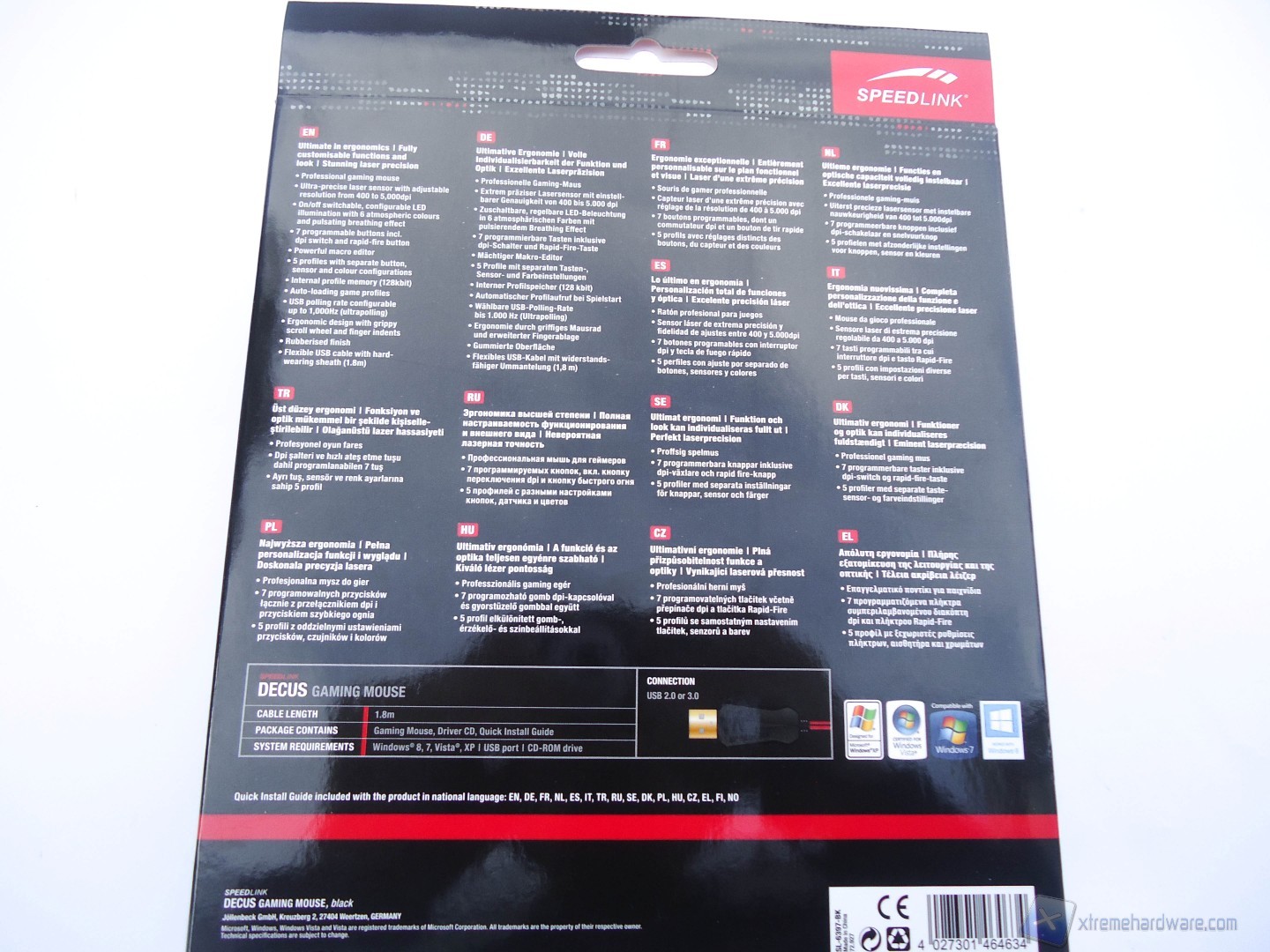 Passando alla parte posteriore della confezione troviamo le varie caratteristiche tecniche del prodotto scritte in varie lingue tra cui l’italiano, inoltre più in basso troviamo dei bollini che ci enunciano la compatibilità con la maggior parte dei sistemi operativi di casa Microsoft.