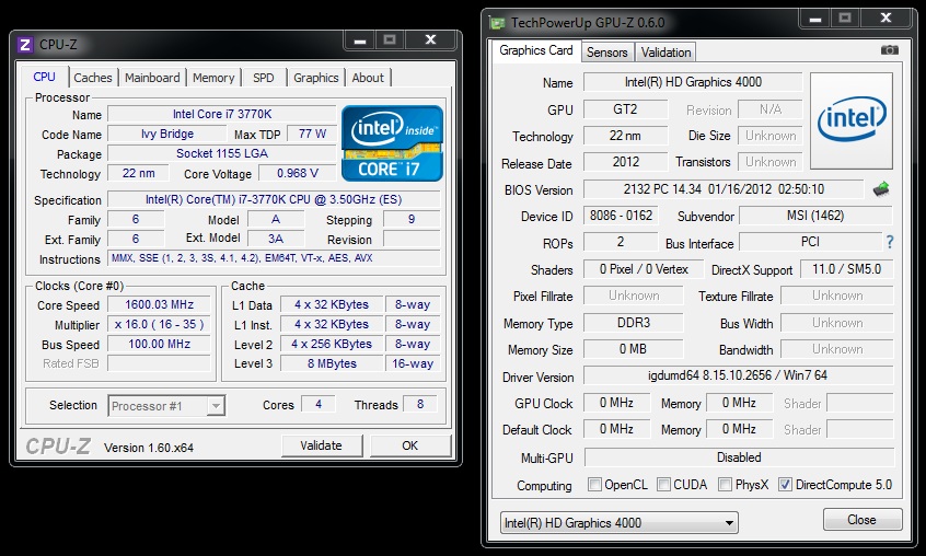 L'esemplare testato oggi, il Core i7 3770K, presenta specifiche del tutto identiche alla CPU Core i7 2700K per quanto riguarda tutte le caratteritiche tecniche relative alla CPU, vera e propria. Cambia invece la GPU integrata, che presenta 4 unità elaborative in più ed opera ad una frequenza inferiore, come pure il TDP. Di seguito uno screen di CPU-Z.