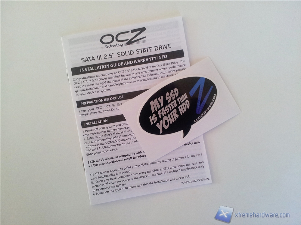 Nella parte anteriore spicca l'immagine glossy in rilievo del drive seguita dalla denominazione del modello, cromata ed anch'essa in rilievo. Poco più in basso sono presenti alcune informazioni riguardanti il drive e l'adesivo inerente alla capacità del drive acquistato; nel nostro caso, il modello offertoci dalla OCZ, è da 256GB. In alto a destra è presente invece il bollino Indilinx Infused che sta ad indicare l'utilizzo del controller Indilinx.