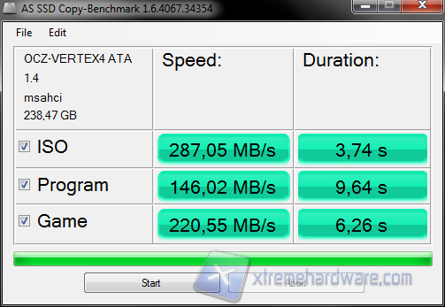 Ed ecco il Vertex 4 dare il meglio di sé, lo score riscontrato con AS SSD la dice lunga sul chip Everest 2 e le tecnologie utilizzate, il drive infatti esce a testa alta da questo test bruciando gli avversari, un pochino peggio nei test AS SSD compress e AS SSD copy dove comunque raggiunge ottimi risultati:
